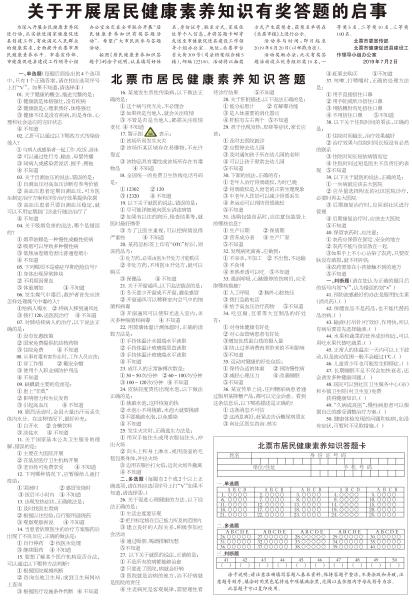为深入开展全民健康素养促进行动,扎实推进国家健康促进县创建工作,有效满足人民群众的健康需求,全面提升北票市居民健康素养水平。市委宣传部、市健康促进县建设工作领导小组办公室决定在全市联合开展“居民健康素养知识有奖答题活动”。希望广大市民跃参与答题活动。