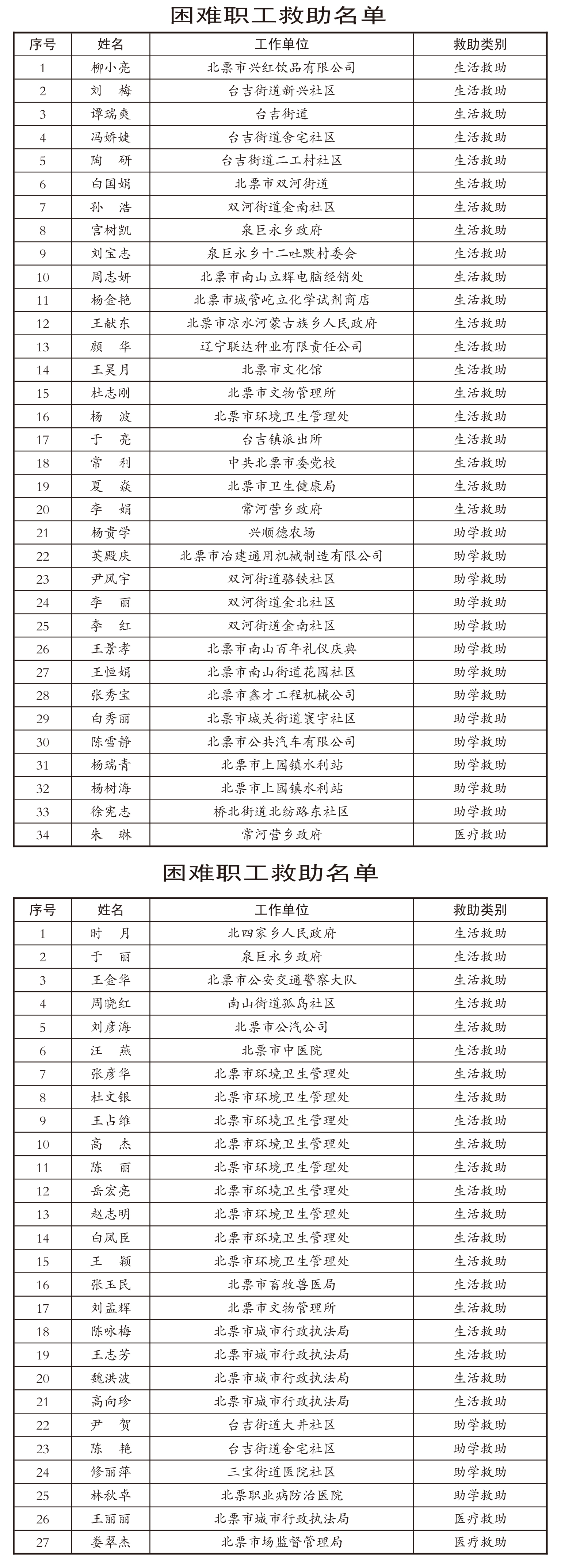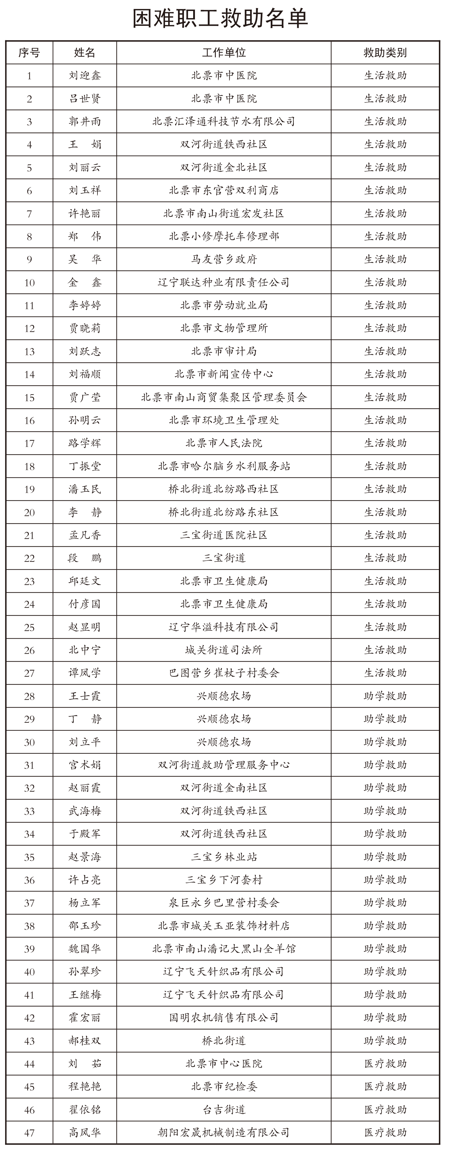 为了贯彻落实困难职工帮扶有关要求,实现精准扶贫,坚持“公开、公平、公正、透明”的原则,市总工会拟对经基层工会申报的并经审核符合困难职工建档救助条件的人员进行公示。欢迎社会各界人士进行监督,如有异议,可拨打监督电话:0421-5873399,或直接到市总工会生活保障部实名反映。